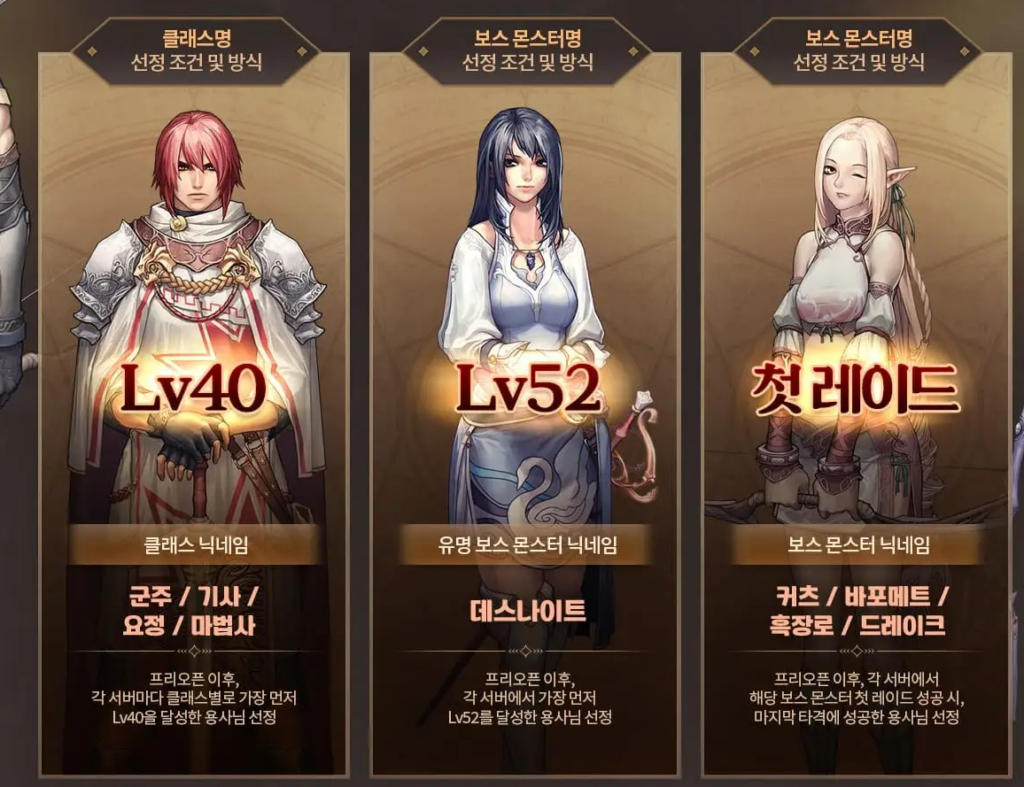 ‘군주’, ‘기사’, ‘요정’, ‘마법사’ 그시절 근본 클래스명 - 유명보스 몬스터 닉네임 : 프리오픈이후 각 서버에서 가장 먼저 52레벨을 달성한 유저 “데스나이트” 지급